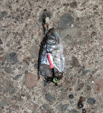 私はササミを餌に三連の仕掛けで釣る