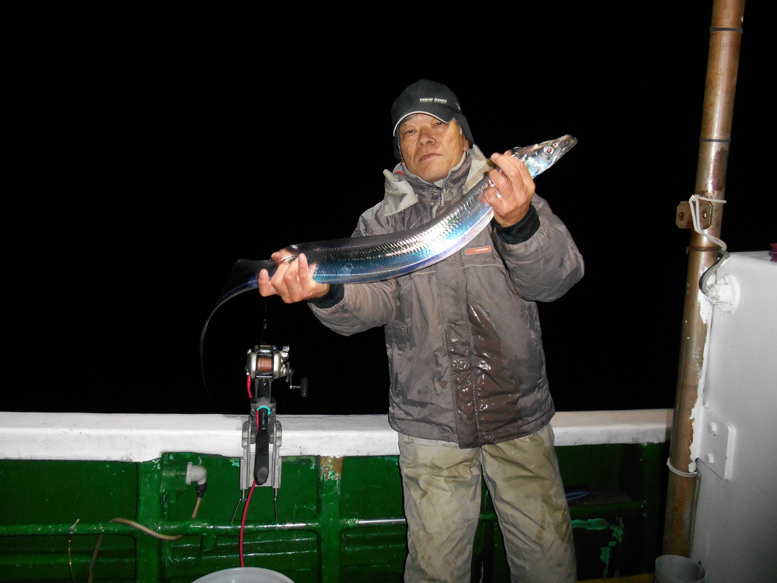 水深60m、タナは50〜30m位を丹念に探ると、50mタナで、指4本サイズが2連続でヒット。長谷川さんも快調に上げだし、中でも指5本級のシッポの先まで計れば、1.3mはあるかと思われる大型だった。私もこの時点では、忘れかけていたタチウオのアタリを思い出したかに思えたのだが・・・。