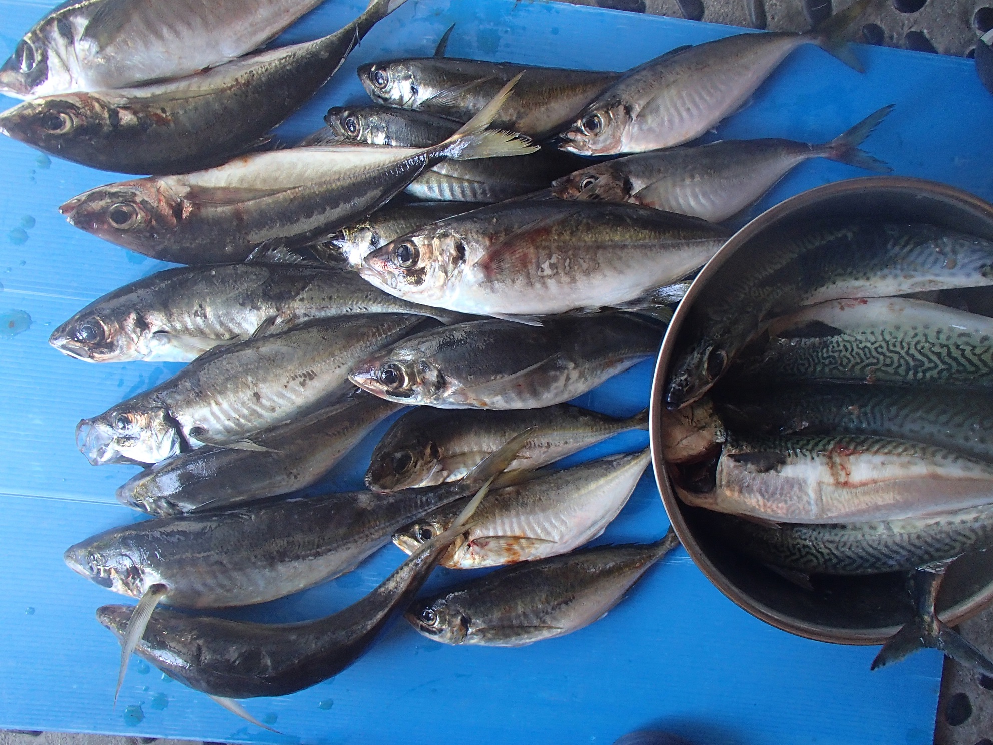 仕掛けを投入してアジのタナまで落ちる前の浅いところで、仕掛けを止めてくれる。しかも回転半径数mを走り回るので、オマツリも多くなる。サバももう少しおとなしく釣れてくれれば、珍重されるのに?・・・