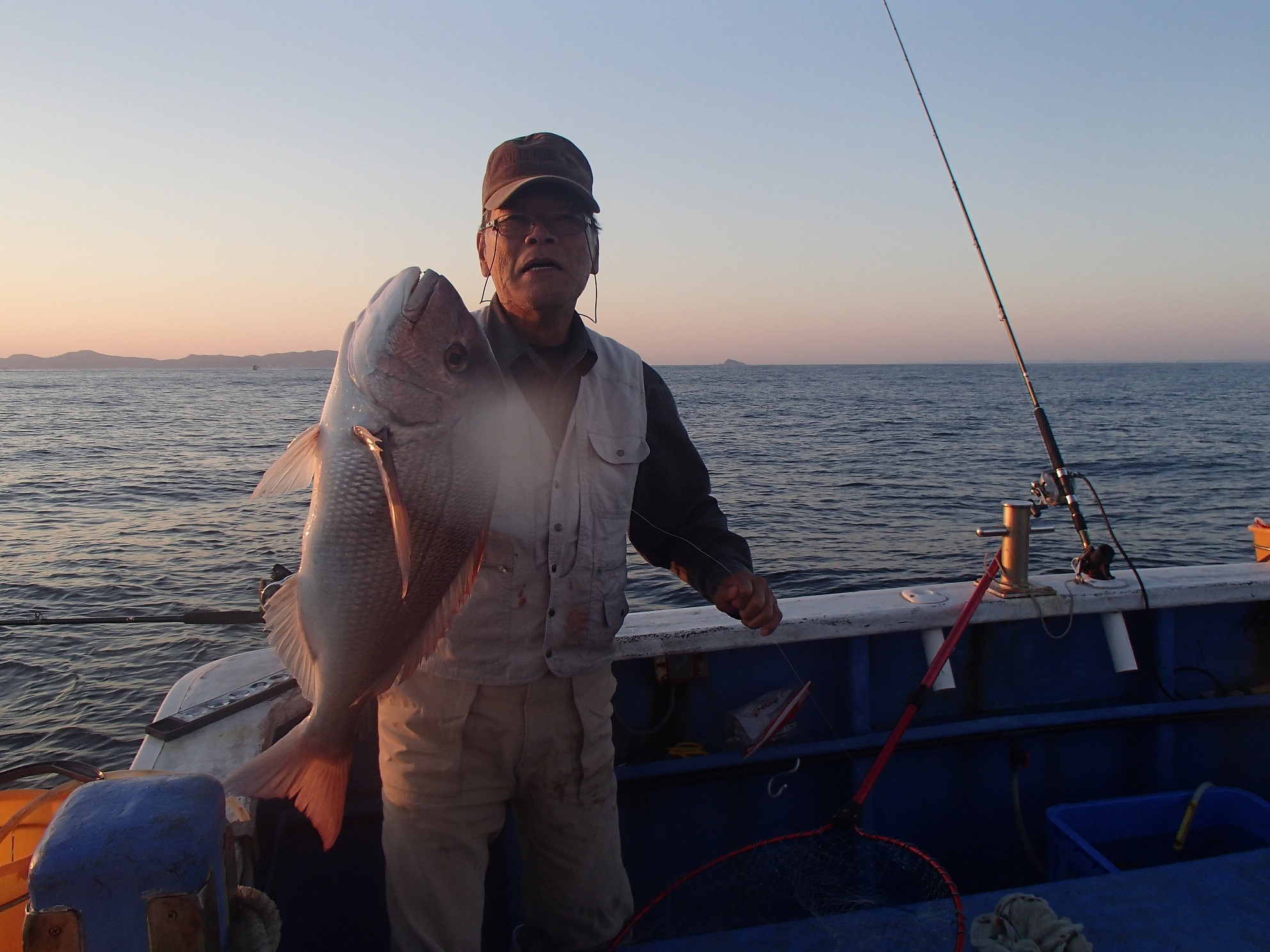 4時半過ぎごろ、太陽が山並みに沈みかけ、速かった潮が緩み出しオモリも徐々に軽くして言った頃、大型マダイのフィーバーとなった。私の左の四日市の水谷さんに60cmUP、長谷川さんに本日一の68cm等々50cmオーバーだけでこの一瞬に船中5匹ぐらいは上がっており、船長はタモ取りに走り回る。