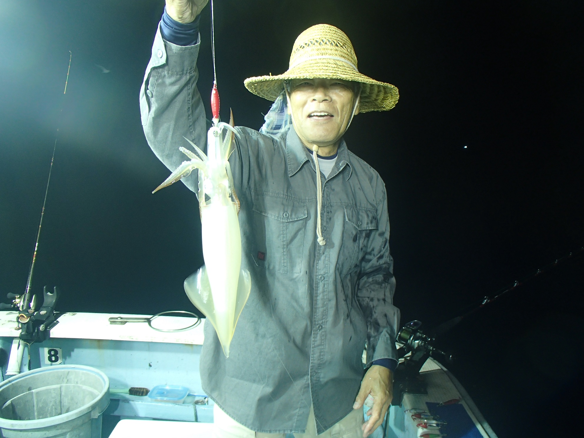 波静かな中、約50分でマイカ釣り場到着、潮が速いのでイカリではなく、パラシュートアンカーが打たれ、陽の落ちた6時過ぎに投入。「タナは65mから上を探って下さい。仕掛けの長い人は85mから上ですよ}との船長合図で期待を込めて第1投。