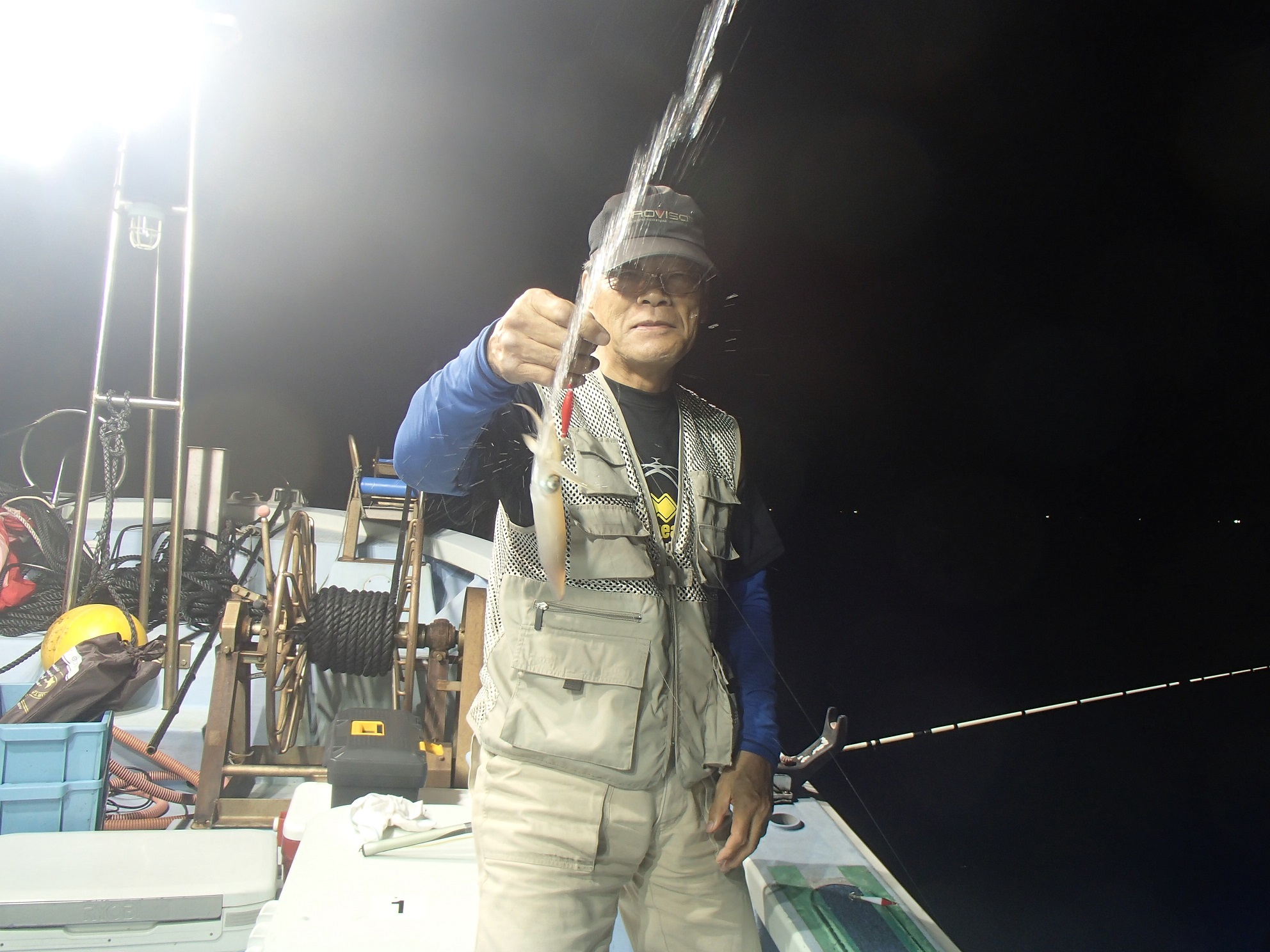 「水深100m、タナは60mから上で始めて下さい」との船長合図で6時半ごろ全員投入したが、明るいうちは、やはり誰にもアタリなく、最初の1パイは左舷側の青野さんに、真っ暗になった7時半ごろ上がった。さあこれからだ、と入れ込んで誘い出したが、一向にタナも上がらず、乗りが悪い。