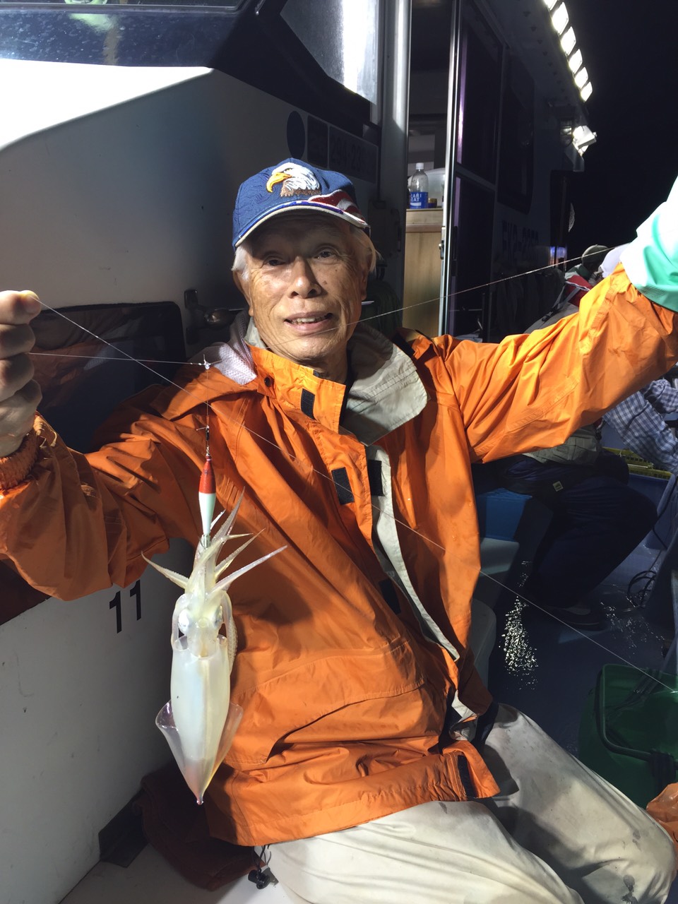 長谷川さんの鉛スッテにもアタリなく、右隣りの大阪の笹山さんは何故かサバに取りつかれて、針外しに苦労している。右舷側で比較的好調だったのはトモ近くの稲葉さんだけ、といった状態。