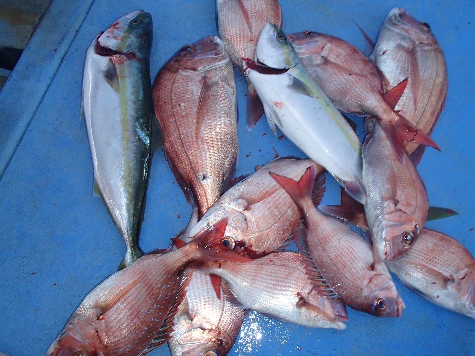 本日の私の釣果は、マダイ30?50cmを11匹、ハマチ45?52cmを2匹。クーラー満杯!