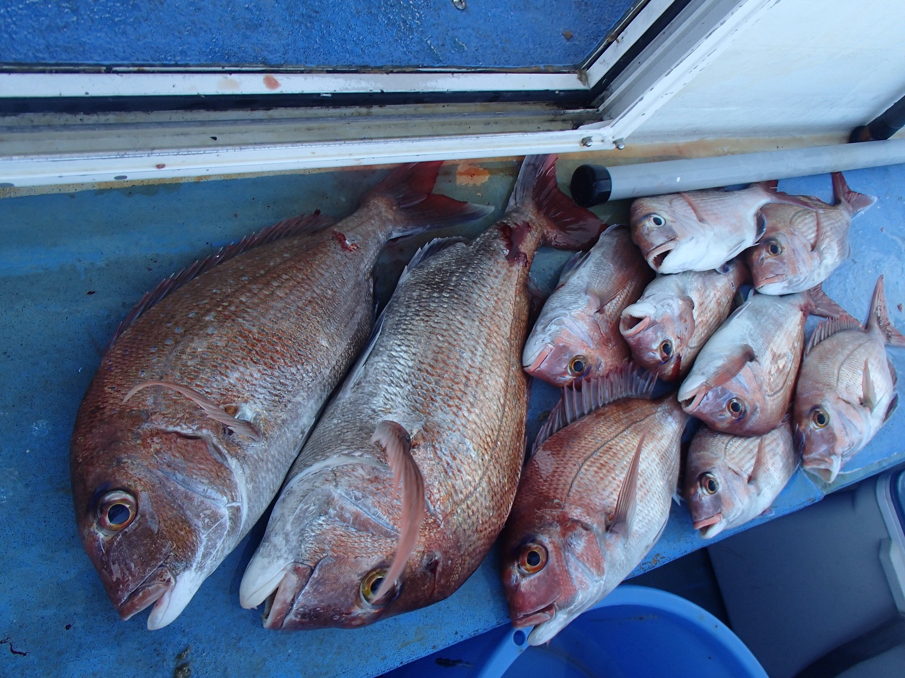 本日の私の釣果はマダイ30?56cmを10匹、内お刺身サイズは4匹。クーラー満杯!。長谷川さんは50cm頭に12匹、船中数でのサオ頭となった。