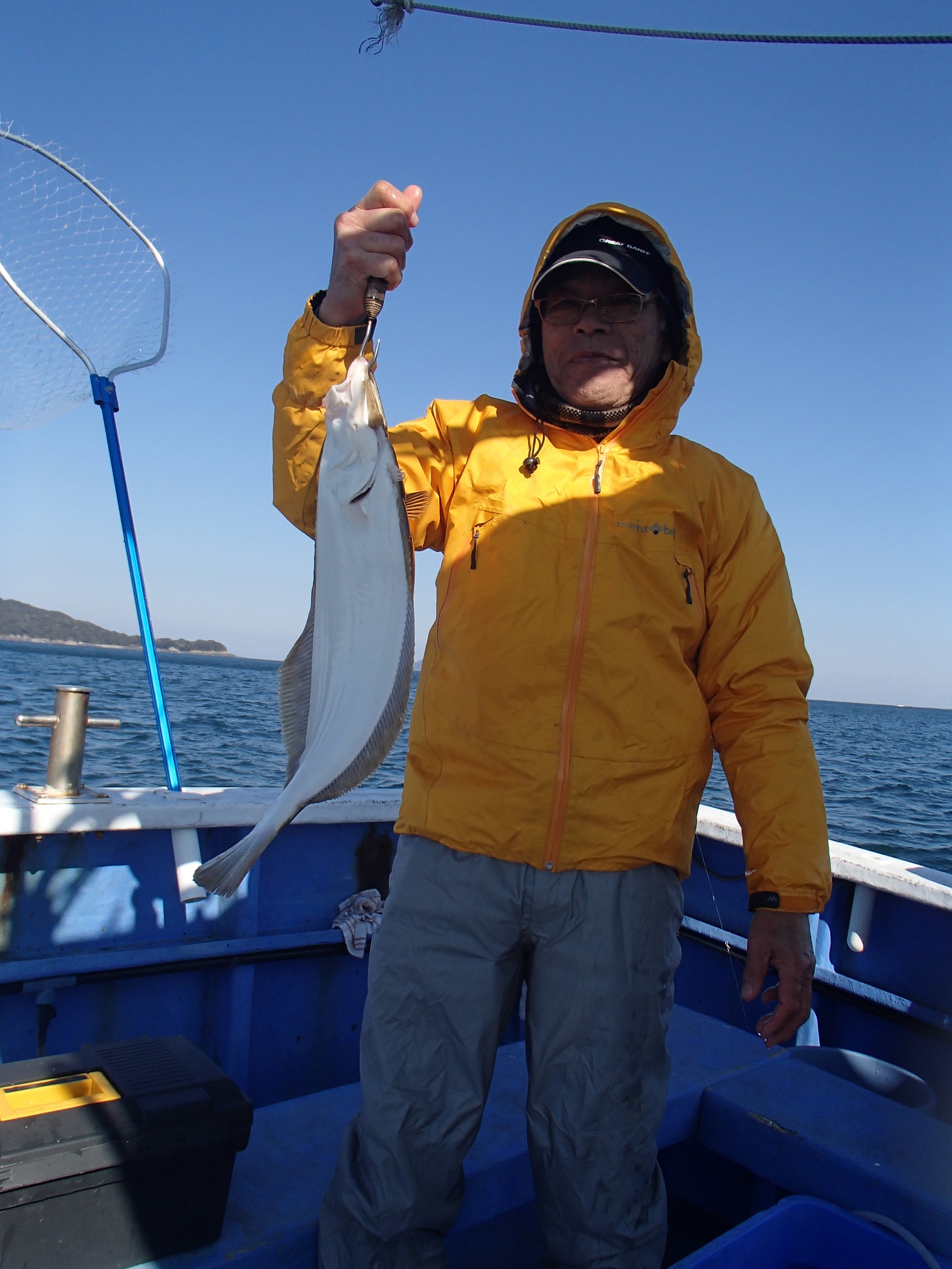 トモの長谷川さんのサオが大きく曲がり、早々と第1号のヒラメ60cmが上がる。肉厚のある立派なヒラメだった。
