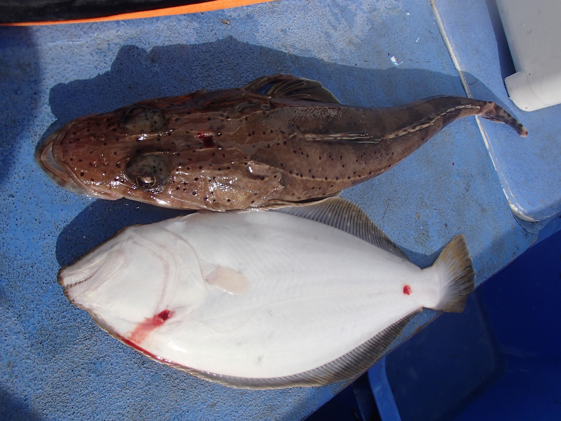 本日の私の釣果は、ヒラメ42cm 1匹、マゴチ52cm 1匹。長谷川さんはヒラメ同級1匹、カサゴ1匹。全船5人で、ヒラメ3匹、マゴチ1匹、カサゴ1匹