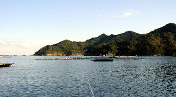 このテントにはこの後も大助かりなのだ!そして段々明るくなって来て回りが見えるようになって来た、これが外向きの様子だ!テントに後ろが内向きだ!そしてポイントがこの写真を向きだけだ!左に笹原さん、右に市川さん、そして私がどちら向きでもやりたい放題だ! そして30分ぐらい経った頃笹原にアタリ、しかしロープに絡んでしまい引っ張っていると小さなアオリイカが見えている!なんとかロープから外しヤエンを入れるが、離してしまった。次に市川さんにアタリ、糸がドンドン出て行く。ヤエンを入れるがアオリイカがかなり遠い所まで行き、浅い所に居るので糸が横になってヤエンが落ちていかないのだ!我々いつもは水面がかなり低い堤防(6.3mのたもがなんとか届く所)でやっているので筏の様に水面が近い所は慣れていないのだ!結局1号のワンタッチ遊動錘を落とすと、その衝撃が強いのかヤエンが届いた頃にアオリイカが離してしまった。下手糞3人組はやっぱりアオリイカを捕ることが出来ないのか?8時笹原さんに二度目のアタリ!糸がドンドン出て行く!五分待ち先程の市川さんを見ているので、「外れてもいいから寄せなあかん」って強引に寄せにかかった。凄い私には怖くて出来ない!案の定外れた、外れた状態で待っていると又乗って来た。ラッキー!というかそういうものなんだね!かなり寄せてヤエンを入れ巻き上げてくるとデカイアオリイカが見えて来た。タモに入れ大成功!