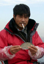 ださぼうが鋭い合わせを入れた瞬間、手がすべり「バシッ」と音がして竿が飛んでいった…手が濡れていて合わせた時に大きな物が掛かると竿が上がらない為手が滑ってしまうのである。竿を取りリールを巻くと魚は外れて居なくなっていた。どうも黒鯛だったらしい!ださぼうはメッチャ悔しがっていた。