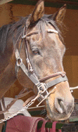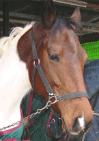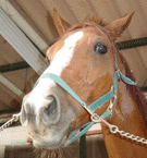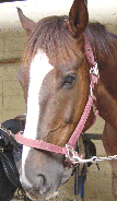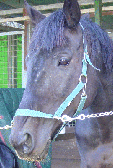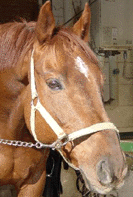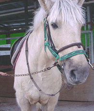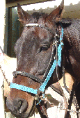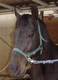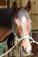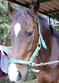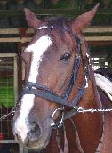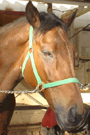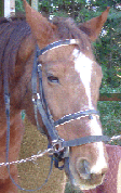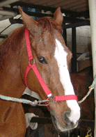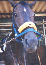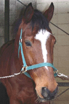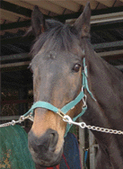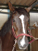 恵那では一番大きい子です。乗るときかなり大変(^^;手綱とか頭絡をよく噛むのでこの子の頭絡はすでにボロボロ。速歩は体が大きいので一歩一歩が大きくてすぐ前の馬に追いついてしまいます。でも常歩はかなりゆっくりです。この子を馬場まで連れて行くといっつも最後になってしまいます。駈歩は騎座を使わないとなかなか持続は難しいです。駈歩班の時では全然ダメでした。駈歩の反動も大きいです。巻乗り・輪乗りは右手前だと膨らむ(蹄跡に戻るくらい)ので外側の手綱をしっかり持って内側の手綱を開いて思いっきり誘導しないとできません。まだ私は一度もうまくいったことなし・・・。左手前はよくできますが。前に馬がいると右手前もいいですが。 | ||