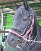 髪型がおかっぱな黒馬です。この子はよく常歩をしてると突然止まって後ろに下がるので難しいです。駈歩も出せればいいんですが持続させるのがなかなか大変です。ある程度スピードがでればあとはスイスイ行くんですが・・・。反動が少なくていいんですけどね〜。一度すごいスピードで頭を下げて走られて暴走されたことが・・・。誘導がスムーズにできます。ジムカーナはこの子に乗ると良いです☆障害もコツがつかめてきていい感じです♪走らせれば最高に乗りやすいです。たまに埒の外に逃げられることもありますが・・・。準備運動でいかに動かせられるかが重要!鞭が嫌いっぽい。ナイスグレイほどではないけど。見せ鞭が効果的。障害も結構80cmくらい飛べる。最近は障害でも長鞭を持たされます。練習はサボリ気味なのに本番はめちゃくちゃおりこうなヤツ。わかっているのね。 | ||