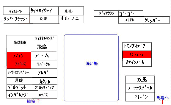 洗い場でおさわがせNO1!手入れや馬装の際はご注意を!反応がいいので拍車を当てすぎないようにしないといけないのでちょっと難しい子です。この子に乗る時はなにより後ろと前の間の距離に注意しないといけないです。最近よく乗るのでなんとか跳ねられずに乗れないかと研究中。よくぽかぽかした日だと洗い場につないでいると寝てしまうので常に見張っていないとダメです。前寝てしまって後ろに倒れそうになってた。障害は勢いがついて速い。障害飛越後が突っ込んでしまいがちなので少しためてから次の障害に向かわせると良いです。馬場の正反動は意外にもやりやすいです。駈歩は結構反動があります。3級ライセンステストはこの子がお薦め☆最近髪型がおかっぱになった(笑)お父さんはエブロス、お母さんはカミノイナズマだったかな?競走馬時代はジーンズウーマンという名前だったらしい(笑)最近手入れをするのが難しくなってきた。「ヒンッ!」とないて蹴りあげる(汗) | ||