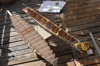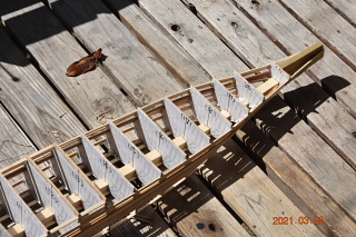 15mmヒノキ角材を竜骨にして 切り出した肋骨を並べる 上部は同時進行中の 空母「龍驤」の船体